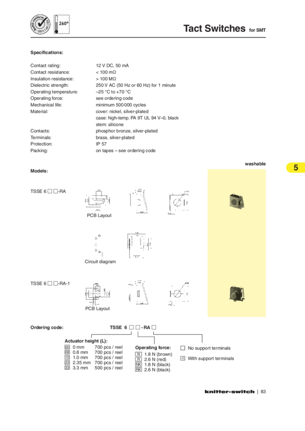 Switch Tactile N.O. SPST Round Button Solder 50mA 12VDC 500000Cycles 2.6N SMD