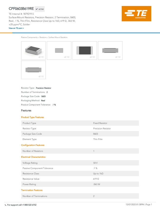 TE Connectivity 1879219-5 Rezystor precyzyjny 619 Ω SMD 0603 0.1 % 25 ppm 1 szt. taśma na dużej rolce