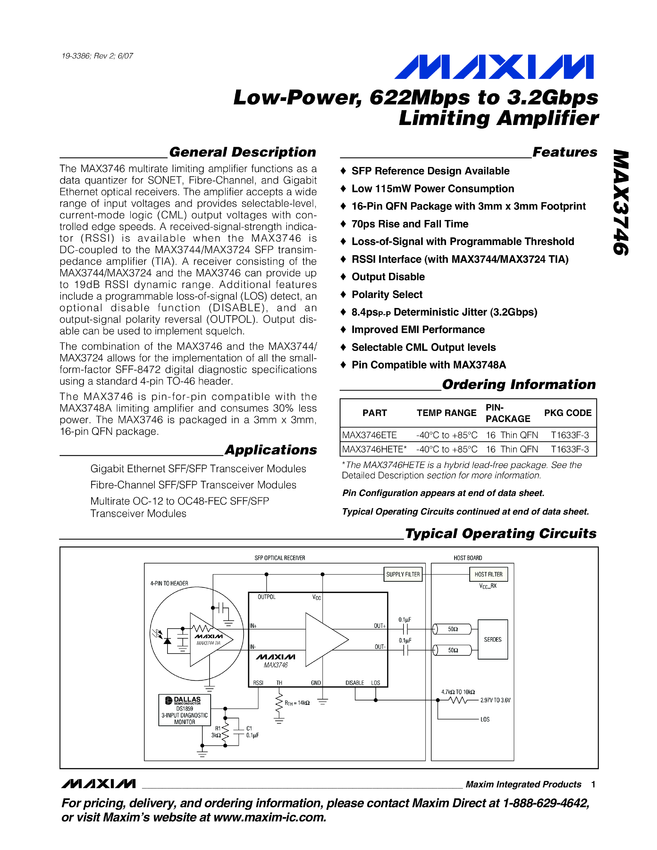 MAX3746 Low-Power, 622Mbps to 3.2Gbps Limiting Amplifier