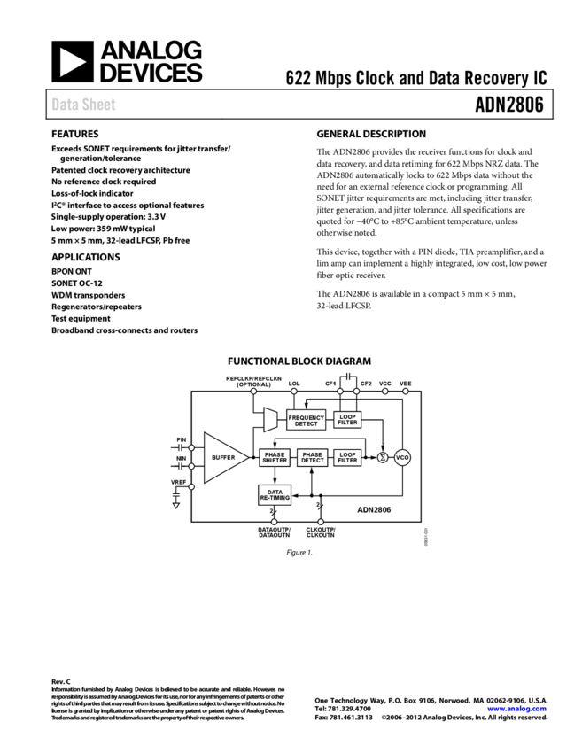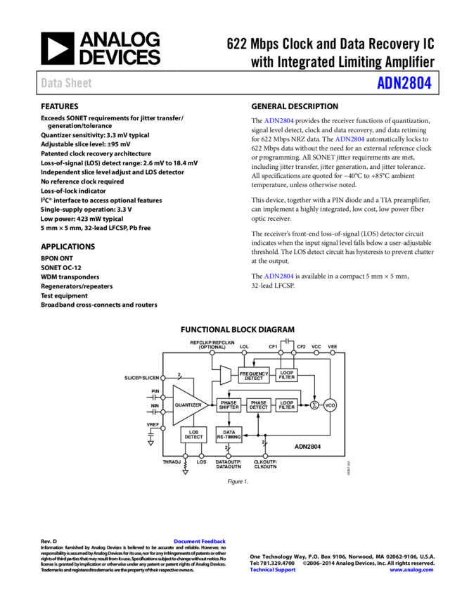 ADN2804: 622 Mbps Clock and Data Recovery IC with Integrated Limiting Amplifier