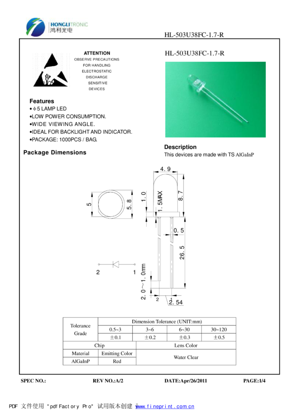 Dioda LED, 5mm, , 620-624 nm, 1015-2900 mCd, water clear, 70 stopni, Honglitronic
