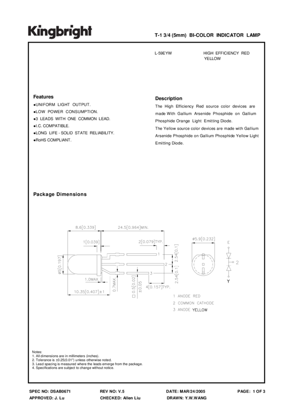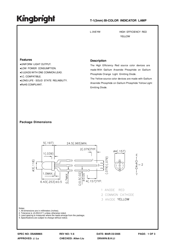 LED Bi-Color Red/Yellow 627nm/590nm Standard LED 3-Pin T-1 Bag