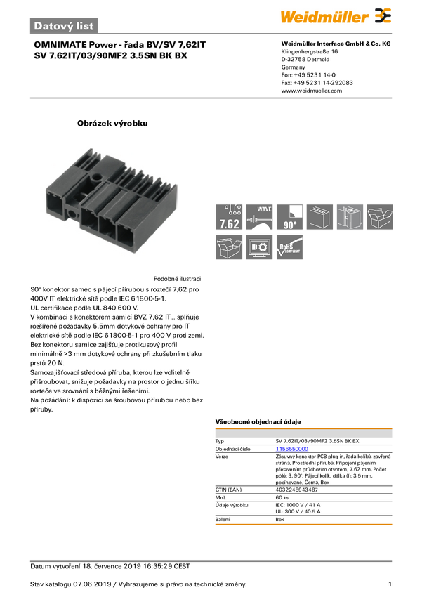 Weidmüller 1156550000 Obudowa złącza pin męskiego na PCB SV 7.62IT/03/90MF2 3.2SN BK BX, wire-to-board, piny: 3, 40.5 A,