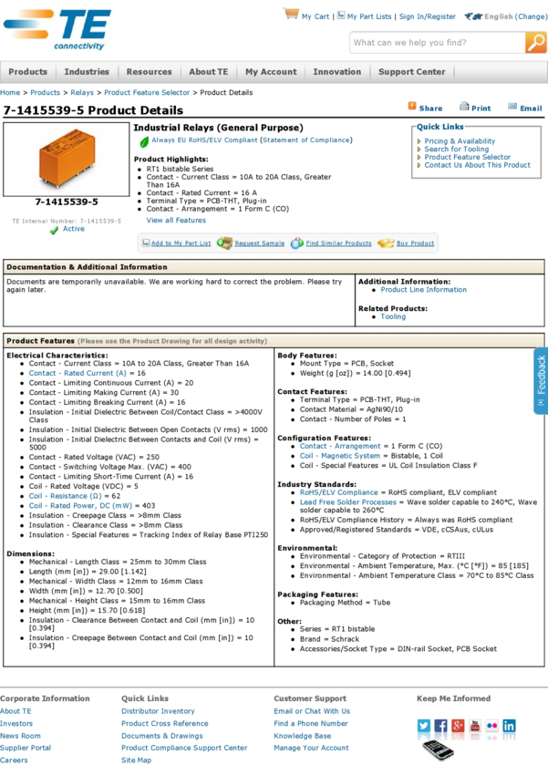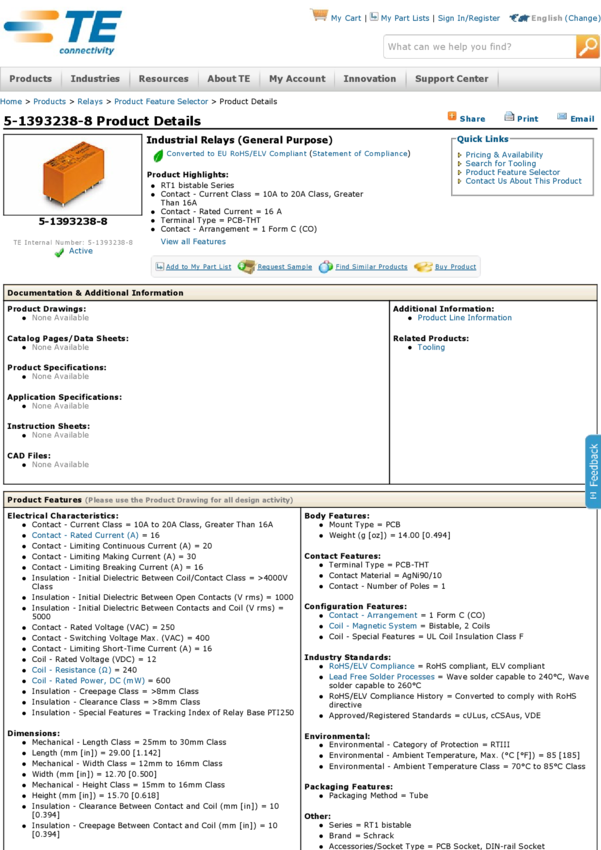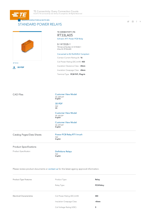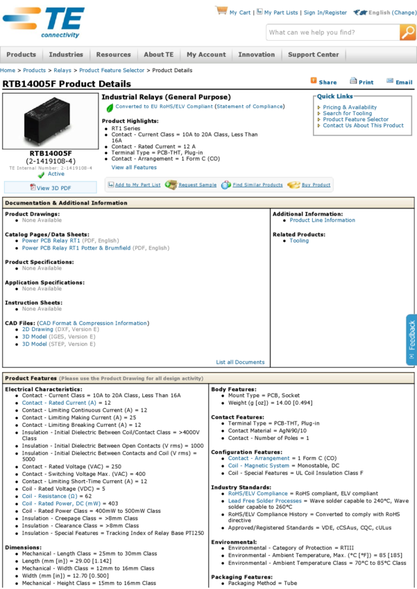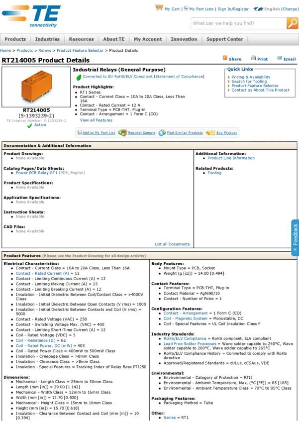 Electromechanical SPDT 16A 5V 62Ohm Thru-Hole