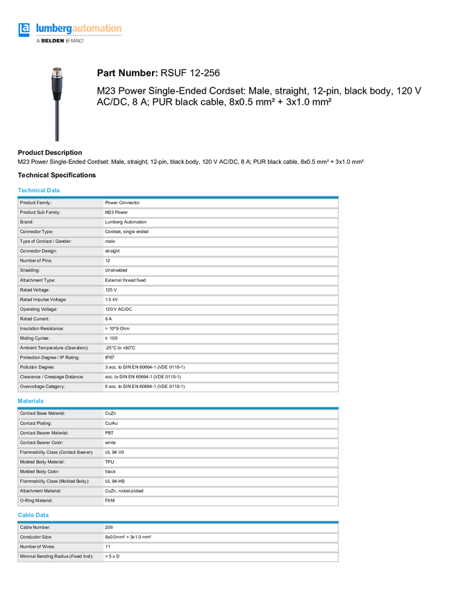 Lumberg Automation 63297 Złącze konfekcjonowane czujnika/aktuatora M23 złącze męskie proste 20.00 m Ilość pinów: 12 1 sz
