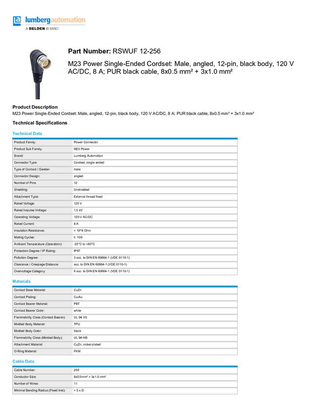 Lumberg Automation 63298 Złącze konfekcjonowane czujnika/aktuatora M23 złącze męskie kątowe 20.00 m Ilość pinów: 12 1 sz