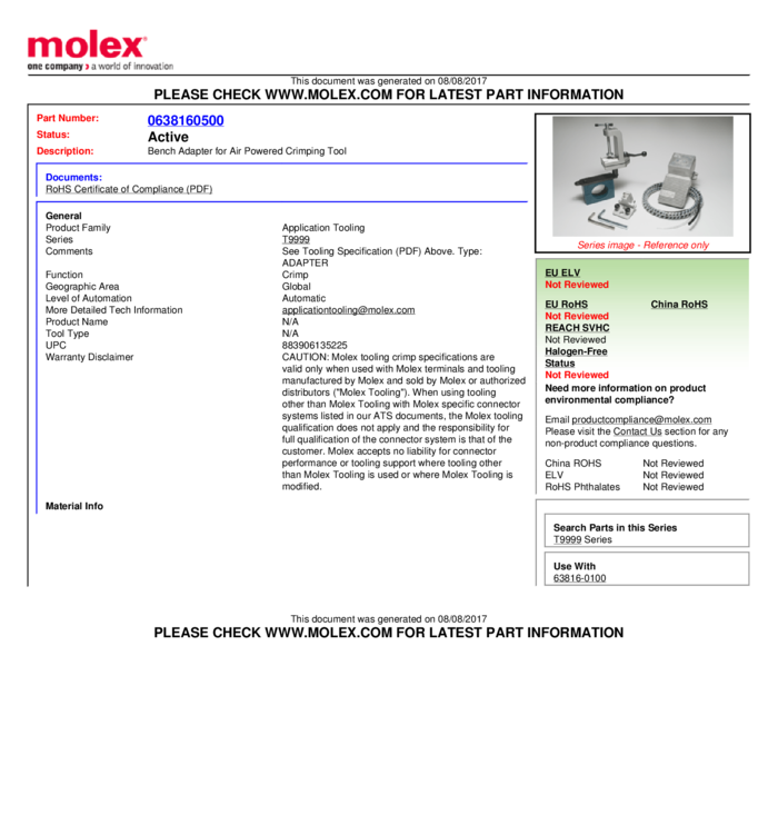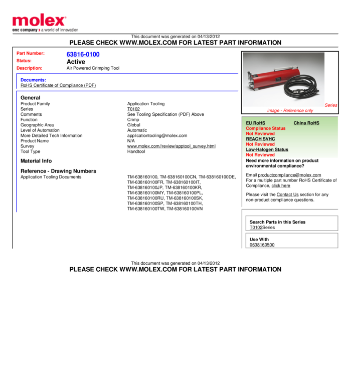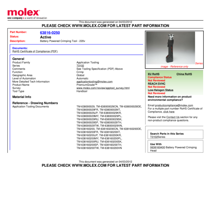 Hand Crimp Tool For 63816-0400 Battery Powered Crimping Head