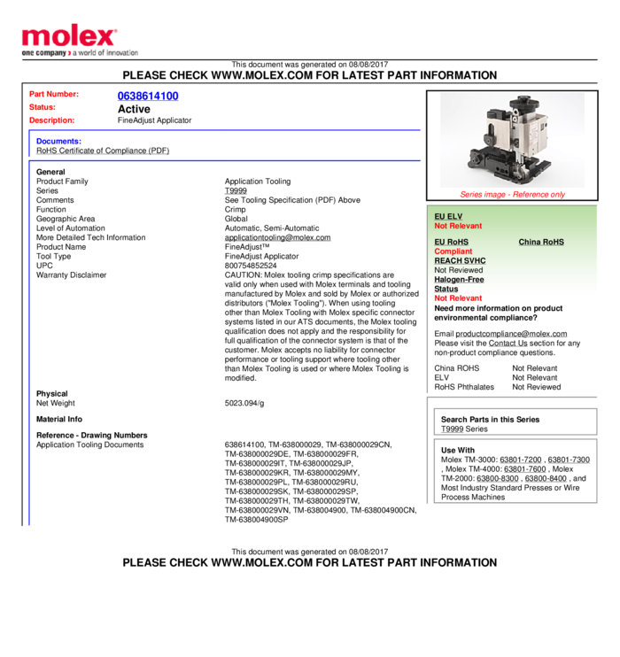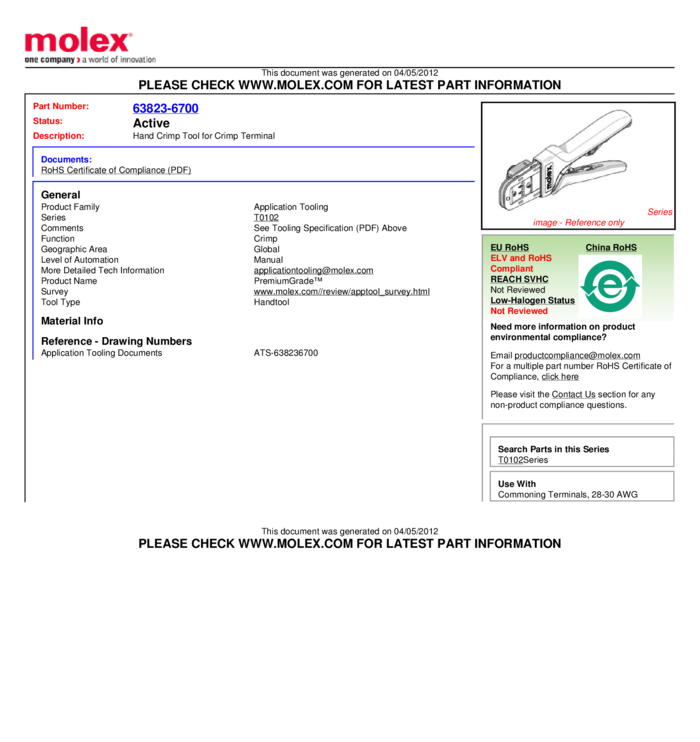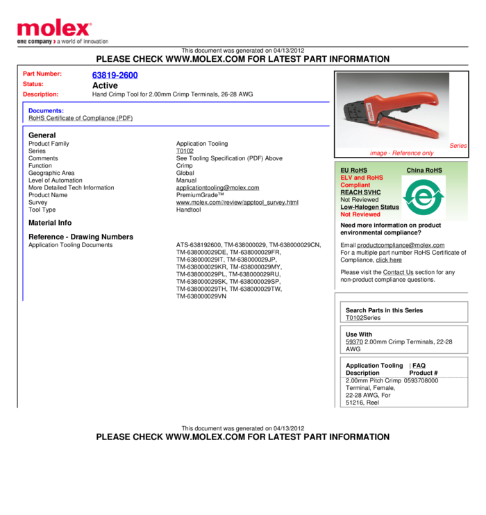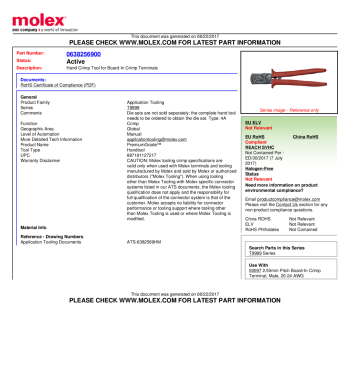 Crimp Tool For 78172 Pico-Ezmate Wire-to-Board Crimp Terminals