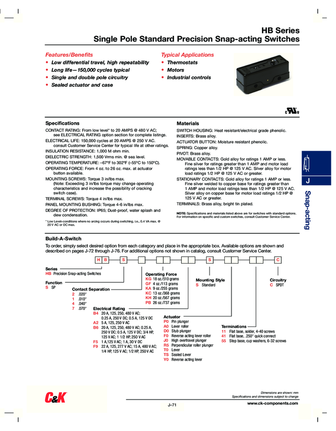 Switch Snap Action N.O./N.C. SPDT Pin Plunger Solder/Screw 20A 480VAC 250VDC 3.63N Screw Mount