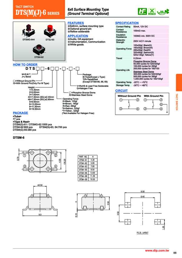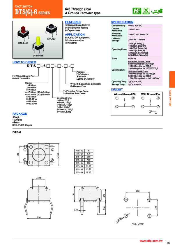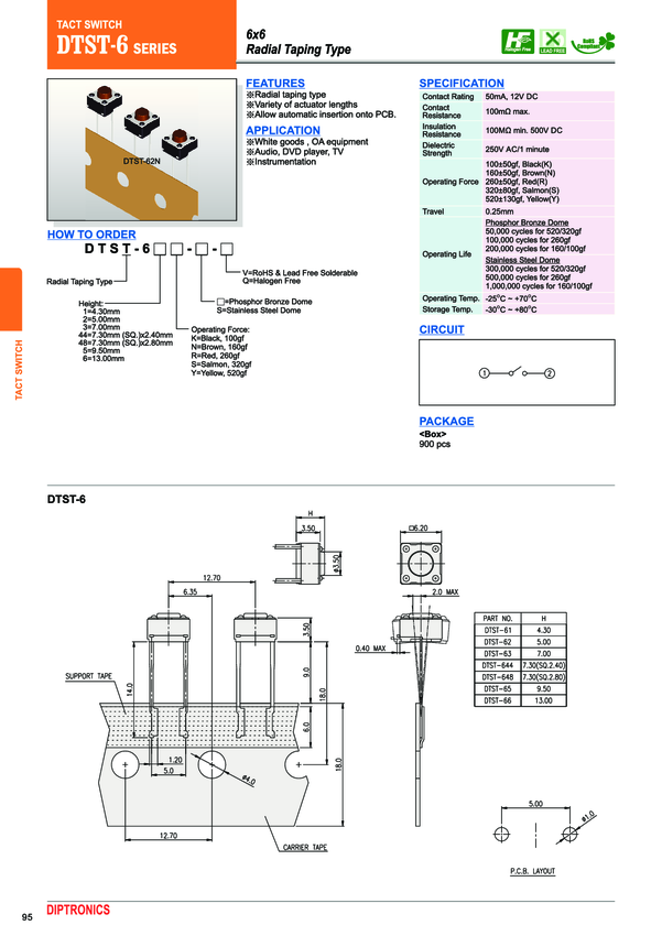 Switch Tactile N.O. SPST Round Button PC Pins 0.05A 12VDC 1000000Cycle 1.56N Thru-Hole T/R