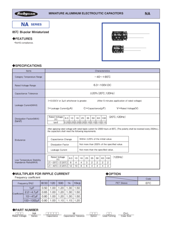 Cap Aluminum 10uF 100V 20% (8 X 11.5mm) Radial Aluminum Cylindrical Can 3.5mm 65mA 2000 hr 85°C Ammo Pack