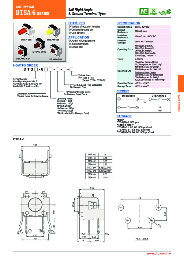 Switch Tactile N.O. SPST Round Button Gull Wing 0.05A 100VAC 12VDC 3.14N SMD Tube