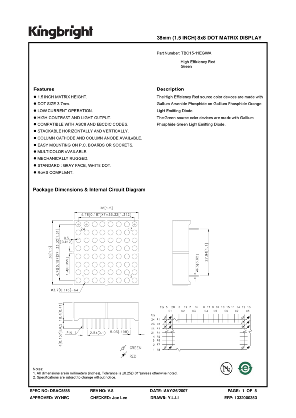 Displays Dot Matrix Module 1DIGIT 64LED Green/Red 24-Pin DIP Tube