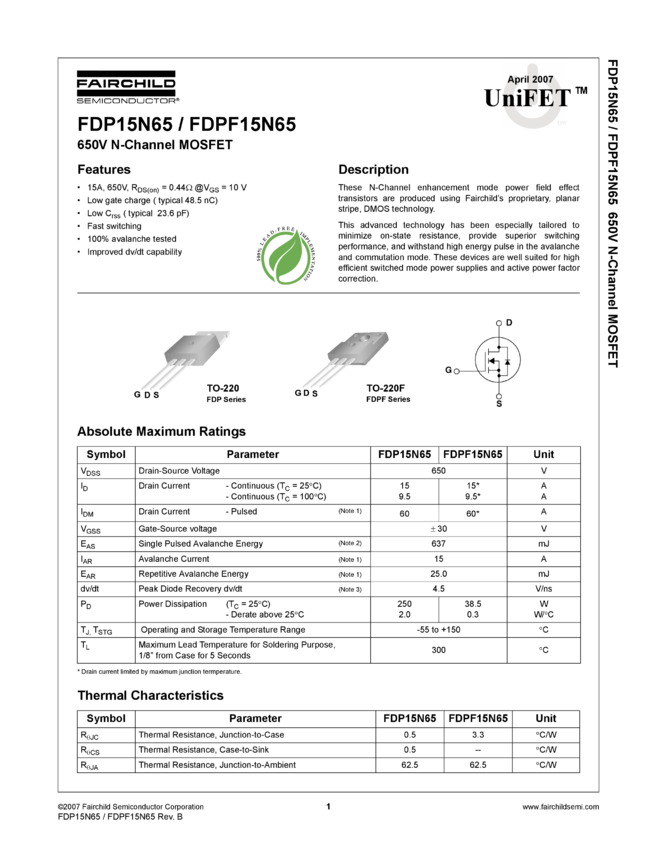 N-Channel UniFET<sup>TM</sup> MOSFET 650V, 15A, 440 mΩ