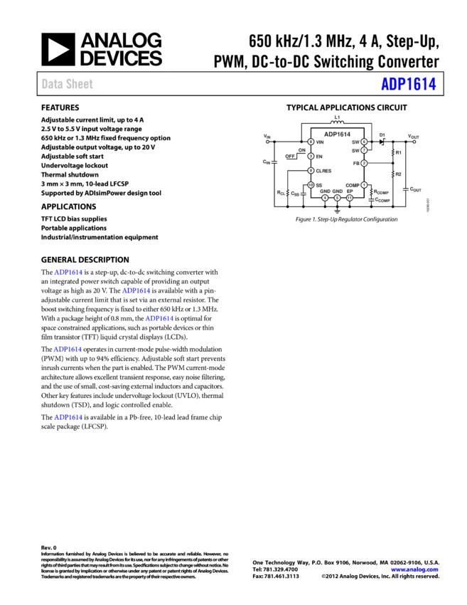 ADP1614: 650 kHz /1.3 MHz, 4 A, Step-Up, PWM, DC-to-DC Switching Converter