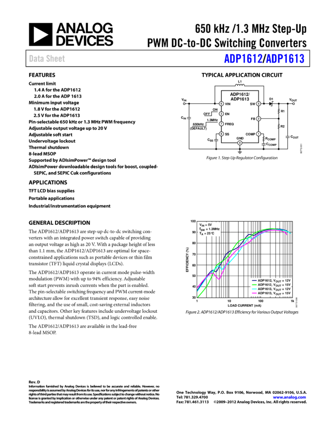 ADP1613: 650 kHz /1.3 MHz Step-Up PWM DC-to-DC Switching Converter with 2.0 A Current Limit