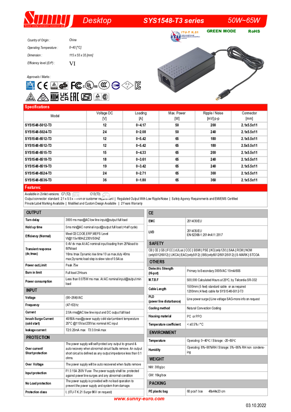 Zasilacz desktop SUNNY 15V 4,33A 65W | SYS1548-6515-T3