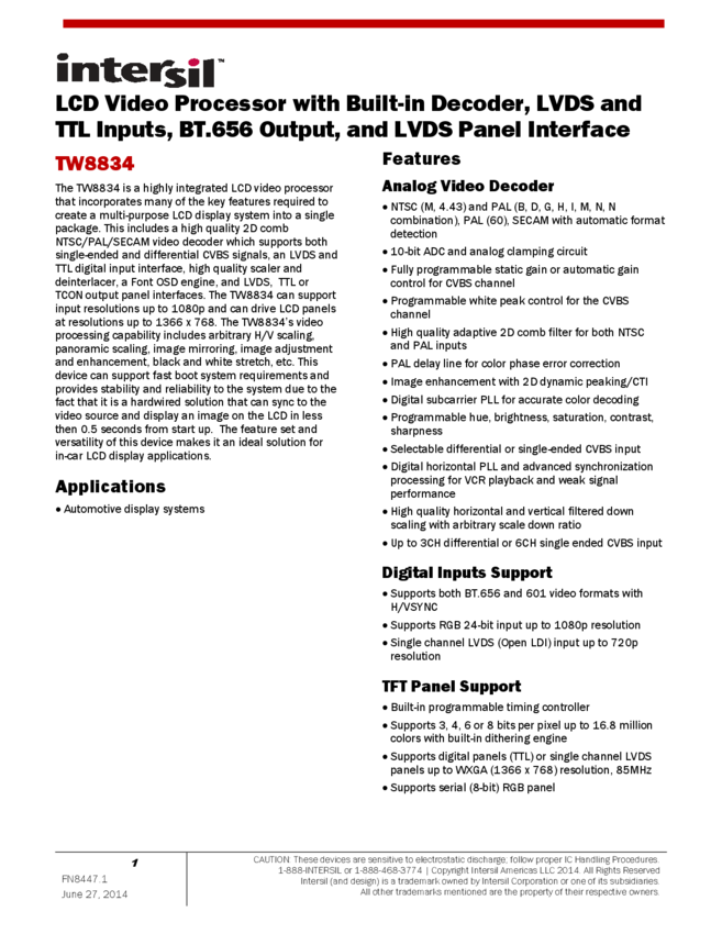 LCD Video Processor with Built-in Decoder, LVDS and TTL Inputs, BT.656 Output, and LVDS Panel Interface