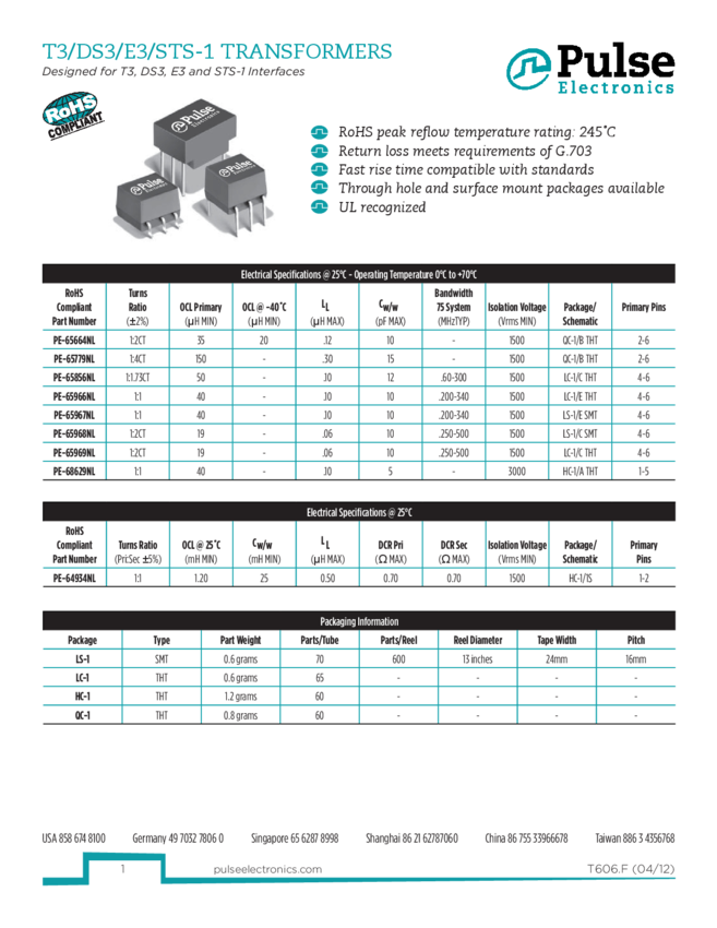 Telecom Transformer 1:1 1500Vrms Surface Mount