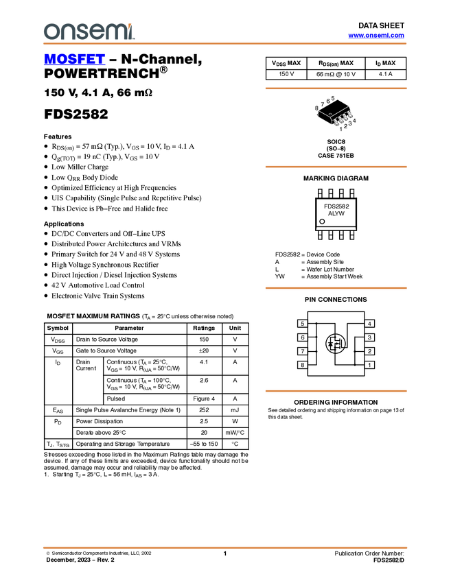 N-Channel PowerTrench. MOSFET 150V, 4.1A, 66mOhm