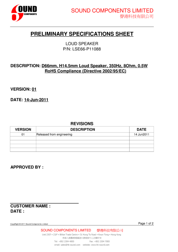 Głośnik stożkowy, 8 Ohm, 500mW, 350Hz-4kHz, fr=350Hz, D=66mm, h=14.5mm