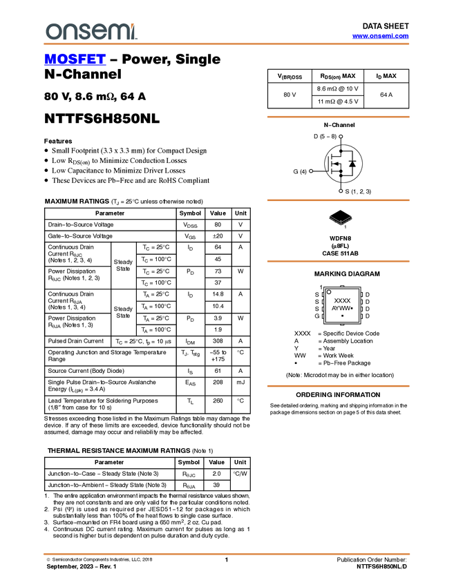 Single N−Channel Power MOSFET 80V, 108A, 8.66mΩ