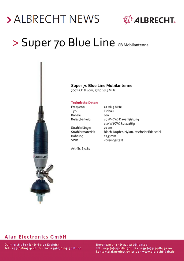 Albrecht 67181 Super70 Blue Line Antena przenośna do CB Rodzaj Lambda 1/4