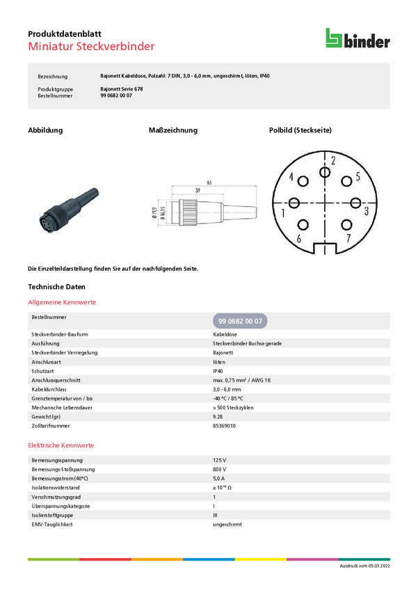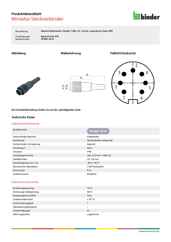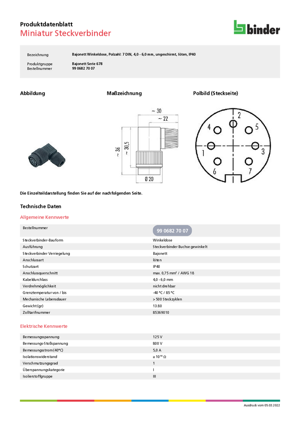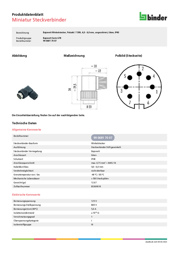 binder 99 0681 70 07-20 Złącze męskie kątowe złącze męskie proste Seria: 678 Łączna ilość styków: 7 1 szt.