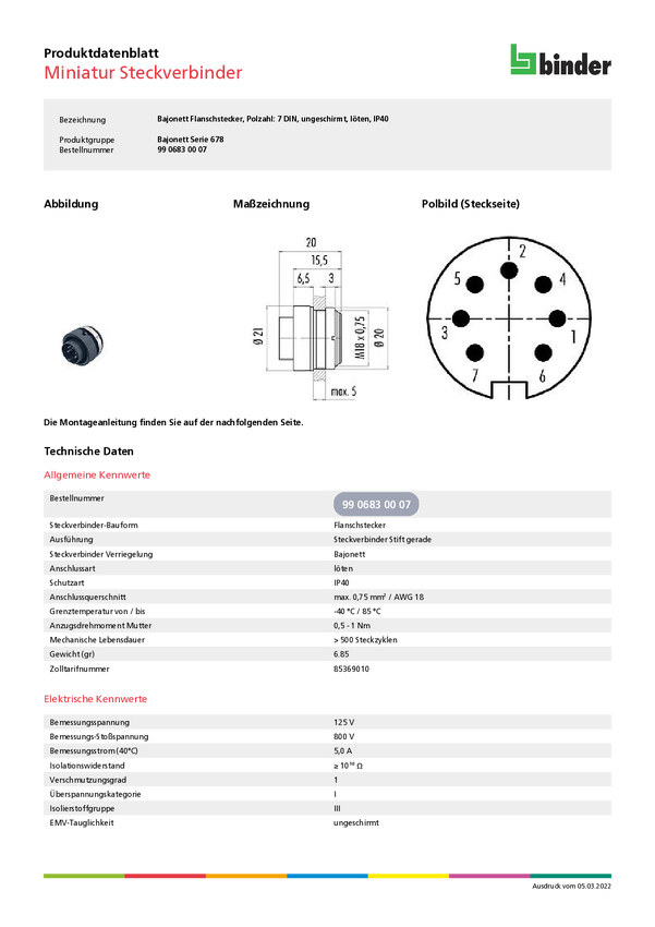 binder 99 0683 00 07-20 Złącze męskie kołnierzowe złącze męskie z kołnierzem Seria: 678 Łączna ilość styków: 7 1 szt.