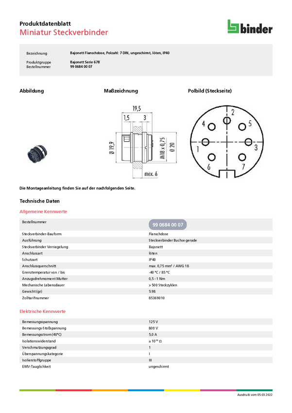 binder 99 0684 00 07-20 Złącze żeńskie kołnierzowe złącze żeńskie proste Seria: 678 Łączna ilość styków: 7 1 szt.