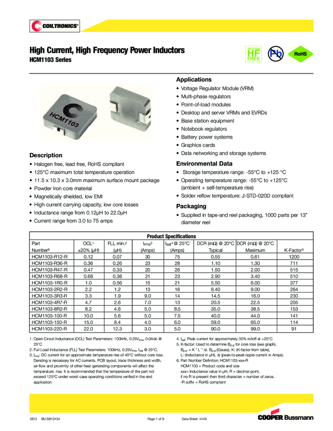 Ind Power Wirewound 680nH 20% 1KHz 26Q-Factor Ferrite 8.5A T/R
