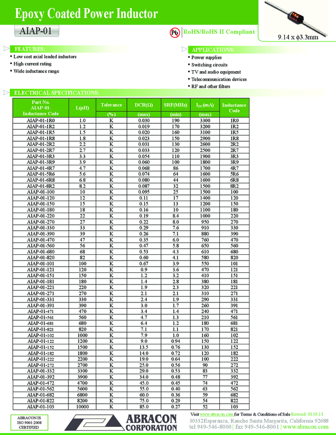 Ind Power 2.2mH 10% 1KHz Ferrite 100mA Axial T/R