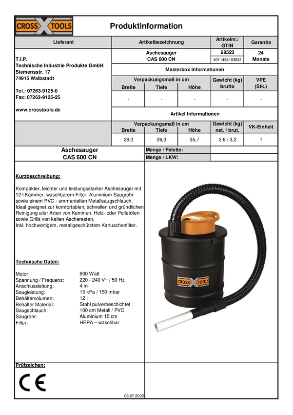 Odkurzacz do popiołu CrossTools CAS 600 CN 68523 12 l 1 szt.