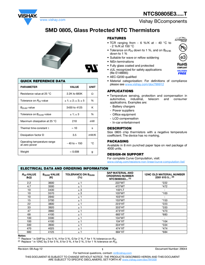 Thermistor NTC 68KOhm 5% 2-Pin 0805 Paper T/R