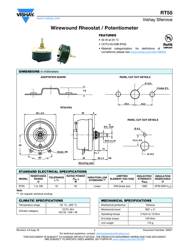 Res Wirewound POT 50 Ohm 10% 55W 1(Elec)/1(Mech)Turn 6mm (89 X 60 X 68mm) Solder Lug Panel Mount Bulk