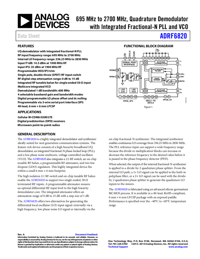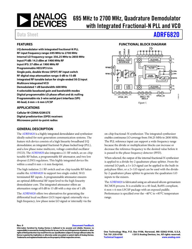 ADRF6820: 695 MH to 2700 MH Quadrature Demodulator with Integrated Fractional-N PLL and VCO