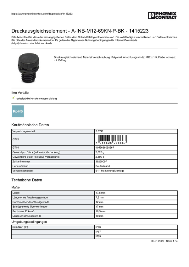 Phoenix Contact 1415223 Element kompensujący ciśnienie A-INB-M12-69KN-P-BK, M12 x 1.5, 5 szt.