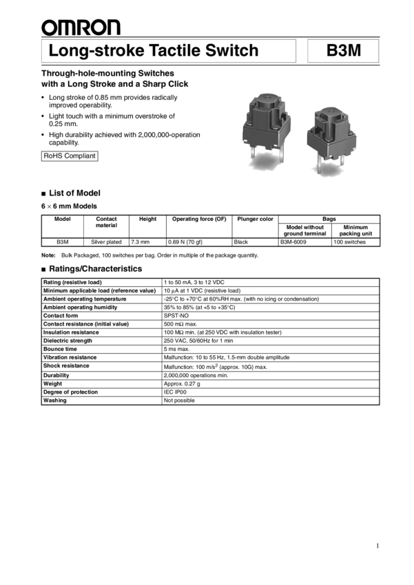 Switch Tactile N.O. SPST Button PC Pins 0.05A 12VDC 0.69N Thru-Hole Bulk