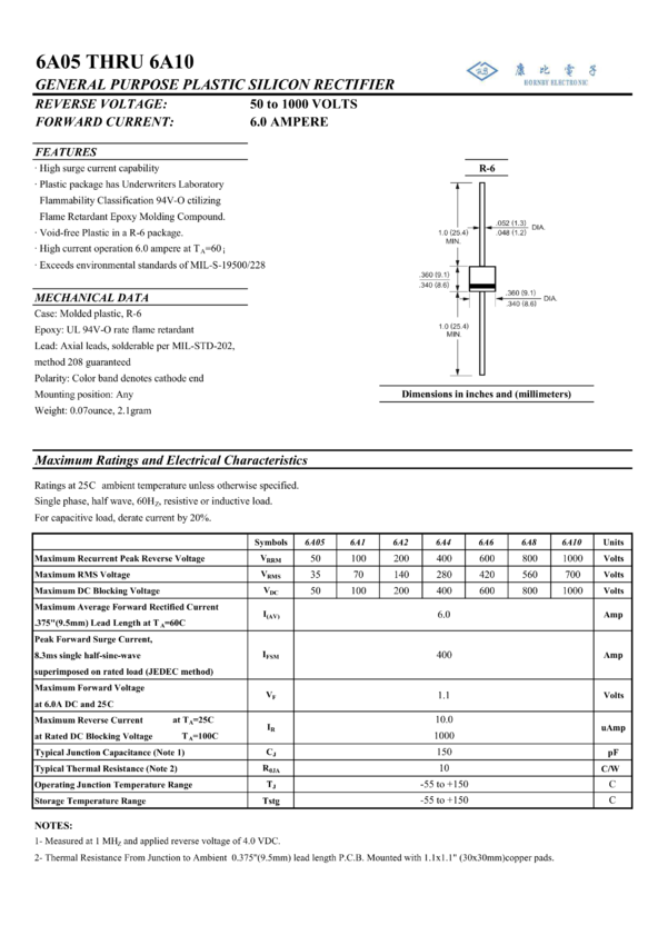 Dioda 6A, 800V, R6 HORNBY ELECTRONIC, ARK