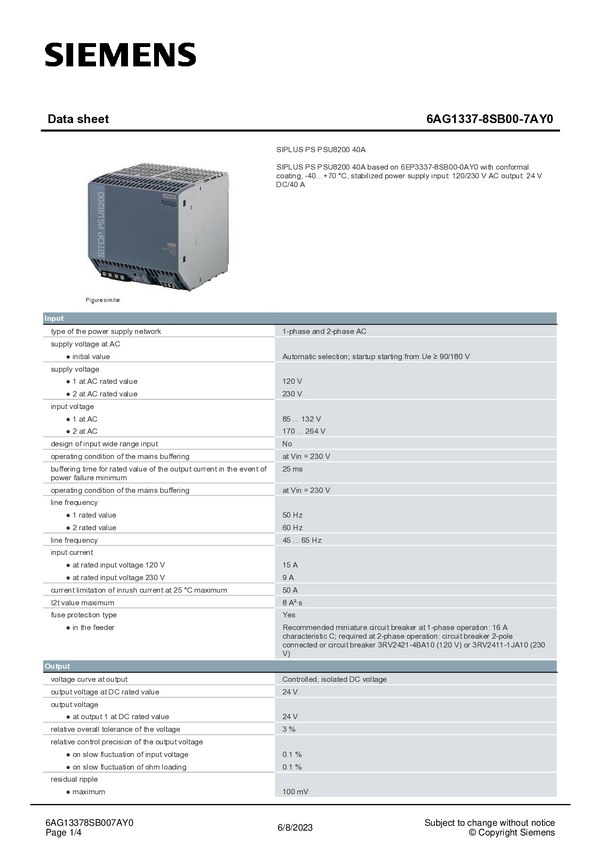 Zasilacz na szynę DIN Siemens 6AG1337-8SB00-7AY0 6AG13378SB007AY0
