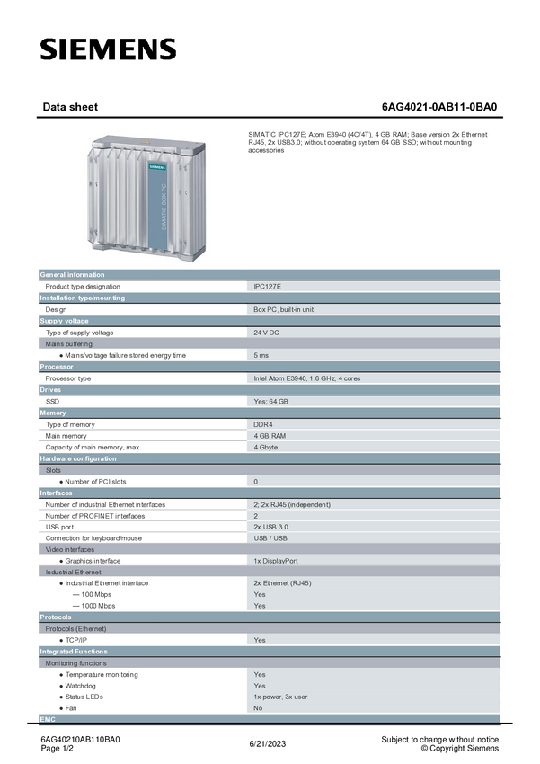 Siemens Komputer przemysłowy PC 6AG4021-0AB11-0BA0 6AG40210AB110BA0