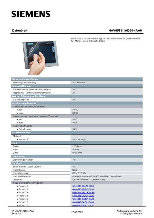 Folia ochronna PLC Siemens 6AV6574-1AD04-4AA0 6AV65741AD044AA0