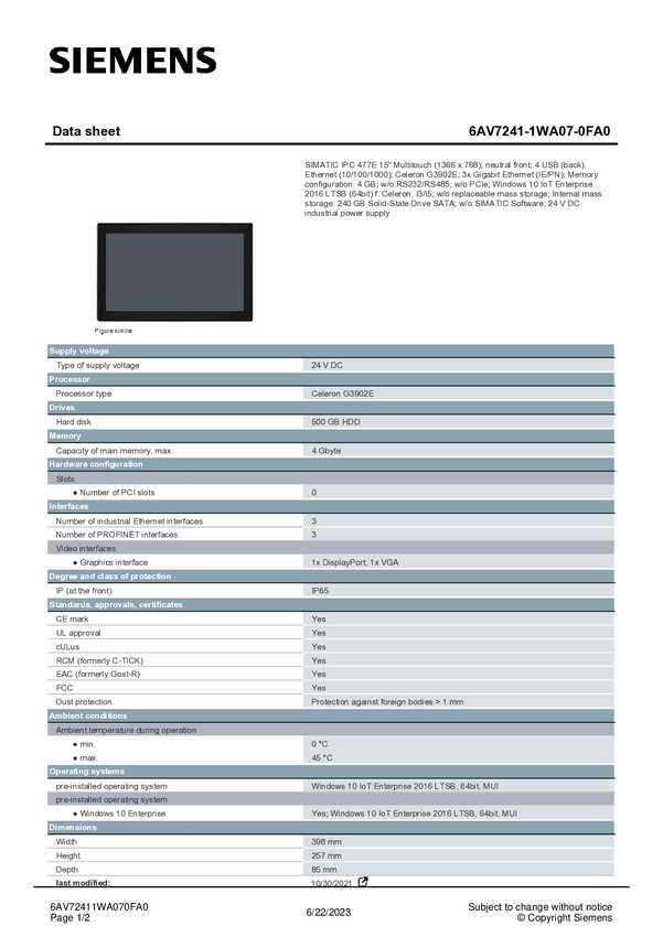 Panel obsługi PLC Siemens 6AV7241-1WA07-0FA0 6AV72411WA070FA0
