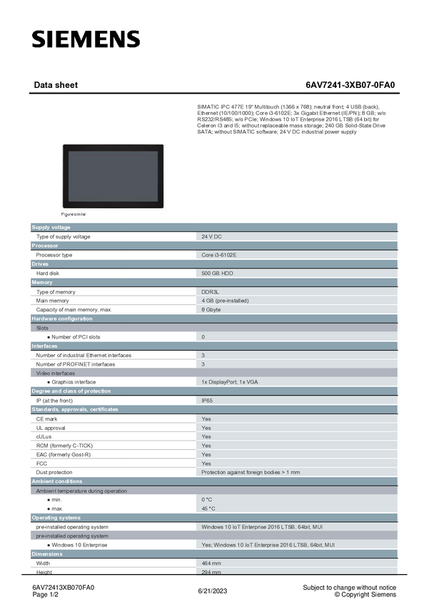 Panel obsługi PLC Siemens 6AV7241-3YA07-0FA0 6AV72413YA070FA0