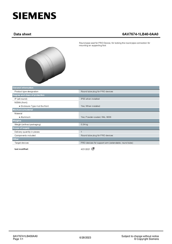 Adapter okrągły rurowy PLC Siemens 6AV7674-1LB40-0AA0 6AV76741LB400AA0