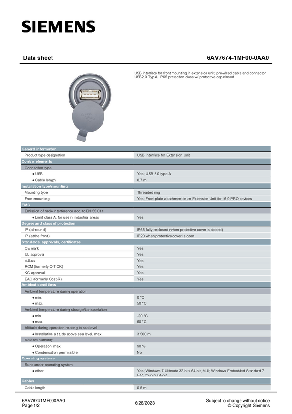 Interfejs USB sterownika PLC Siemens 6AV7674-1MF00-0AA0 6AV76741MF000AA0