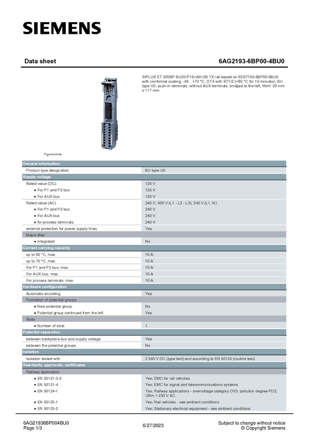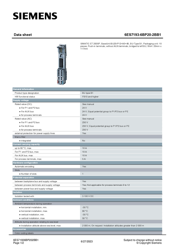 Siemens 6ES7193-6BP20-2DA0 6ES71936BP202DA0 Jednostka bazowa