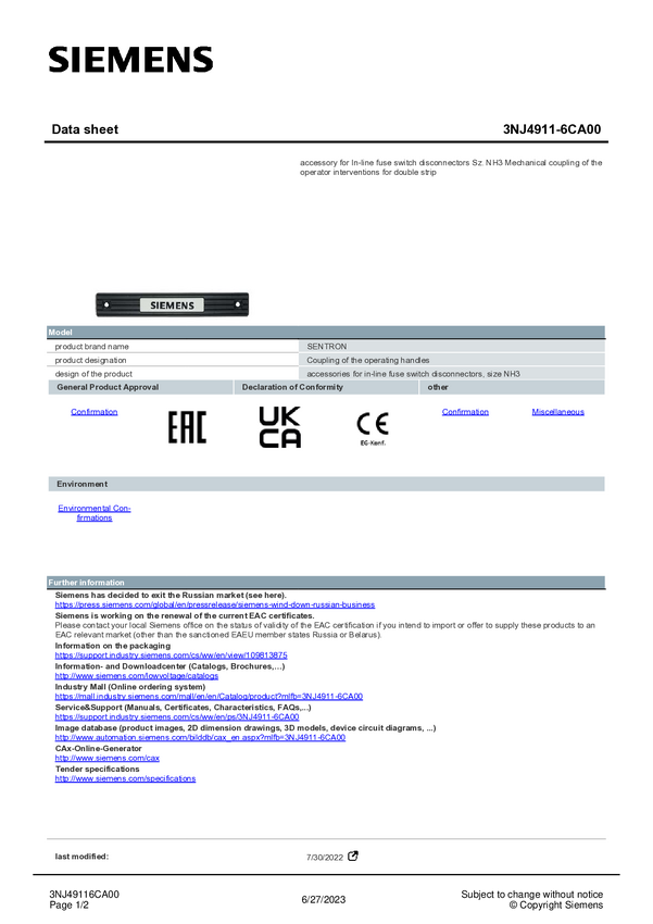 Zestaw akcesoriów Siemens 3NJ4911-6CA00 1 szt.