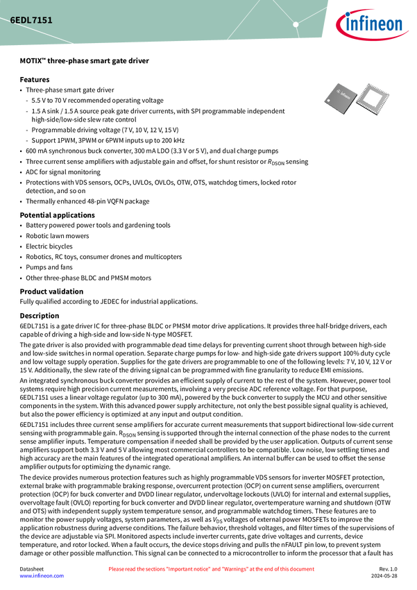 MOTIX™ 6EDL7151 3-Phase Smart Gate Driver The MOTIX™ 6EDL7151 is 3-phase a smart gate driver IC that enables the development of high-performance battery-operated products using BLDC or PMSM motors. The MOTIX™ 6EDL7151 is fully configurable to drive a wide range of MOSFETs to yield the best possible system efficiency and has a full suite of system protection features including VDS Sensors to improve system robustness in severe operating fault conditions.