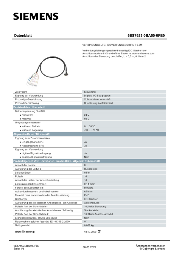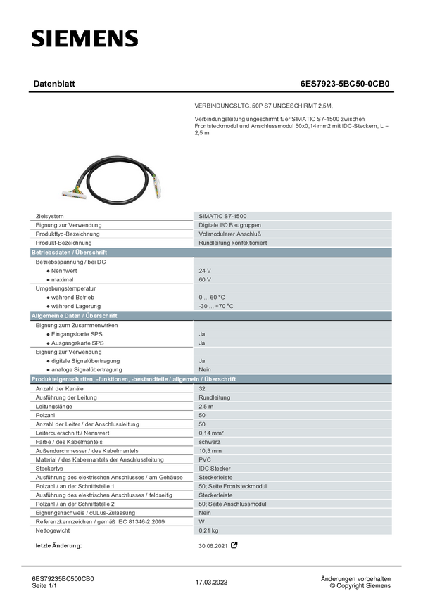 Przewód łączący PLC Siemens 6ES7923-0BA50-0FB0 6ES79230BA500FB0 24 V/DC
